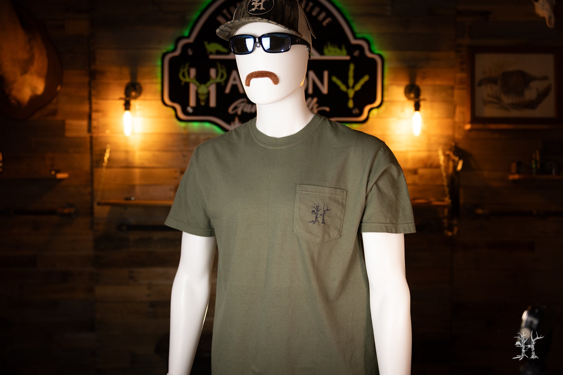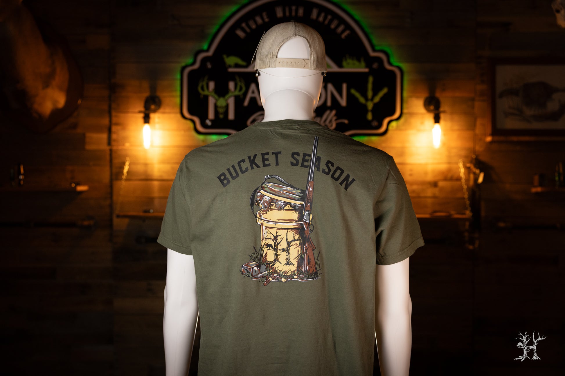 Are you a fan of Dove Season? Boy do we have a shirt for you! Grab your Harmony Game Calls Bucket Season short sleeve t-shirt today. It features a classic dove hunting scene on a Comfort Colors tee in moss.
